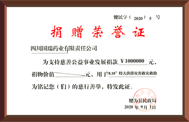 2020年8月18日,四川省犍为县遭遇百年未遇特大洪涝灾害,金年会-金年会(中国)一站式体育服务平台集团国瑞药业向犍为县灾区捐赠现金100万元。